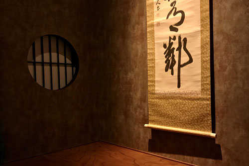 When you go up the stairs along the mushiko mado (insect cage window), you will see the round window at the alcove considered as the moon over Higashiyama.