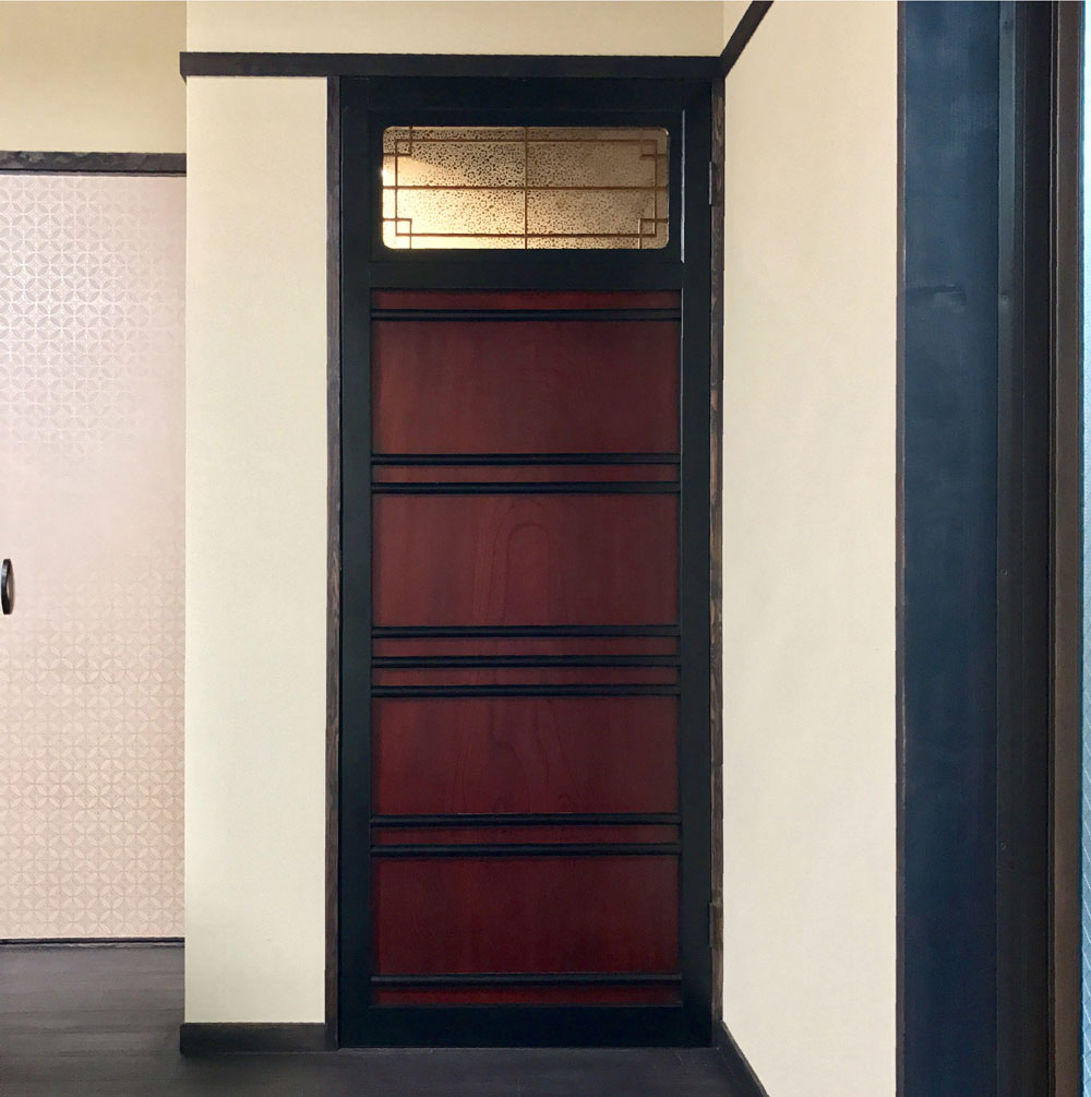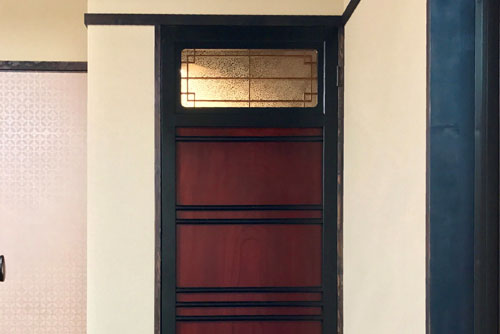 Antique door made of keyaki with the decorative glass
