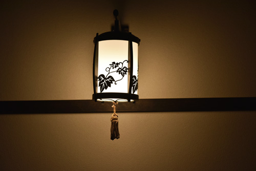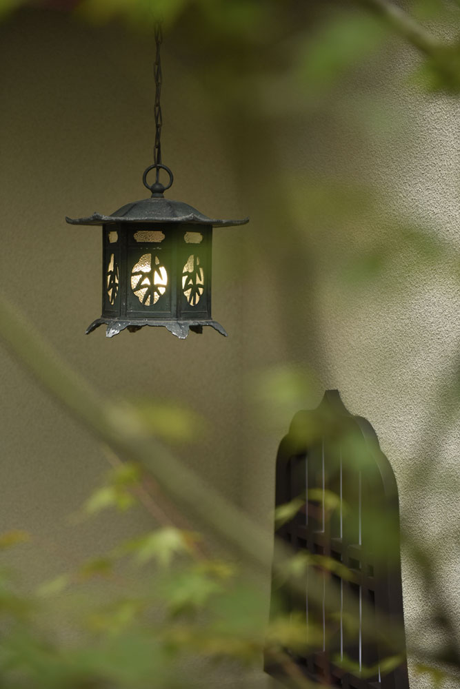 六角屋根,鏤空竹透雕模様的吊燈籠。從結露玻璃中漏出柔光,照亮縁側。